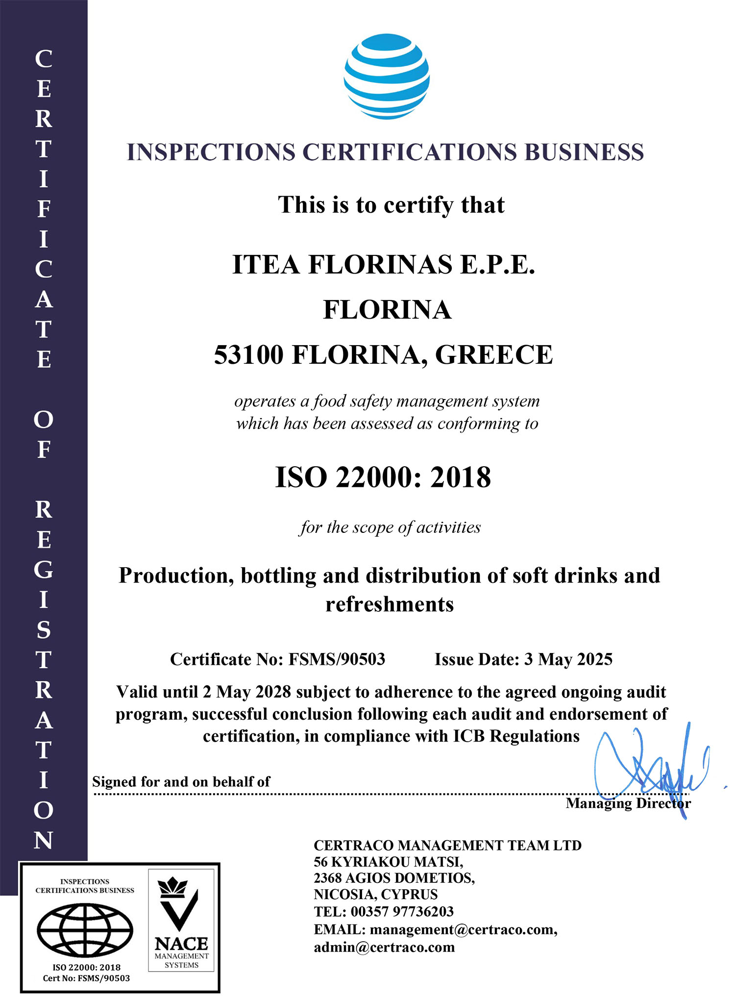 Certifications The production and bottling of soft drinks is done by using the most modern methods and the company is certified according to HACCP and ISO 22000: 2018